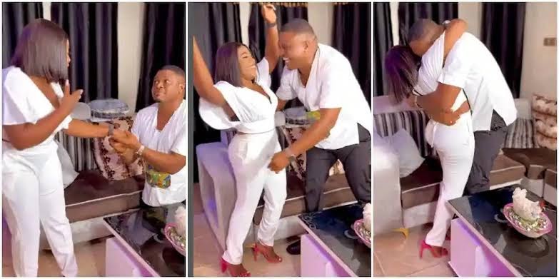 A trending video on social media showed the moment actor Ken Erics engaged Jasmine in the presence of their friends.
